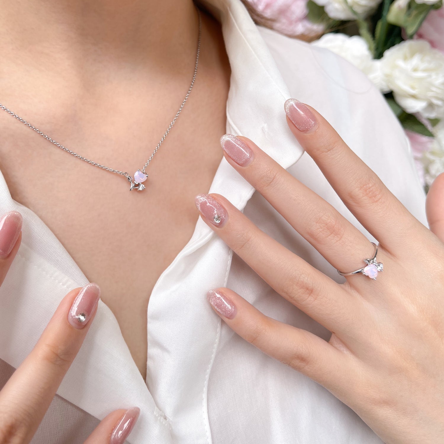 - Set with CZ diamond and CZ pink opal