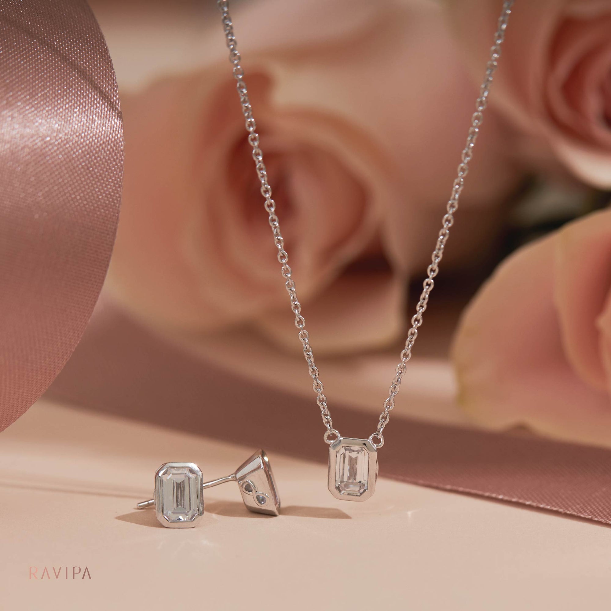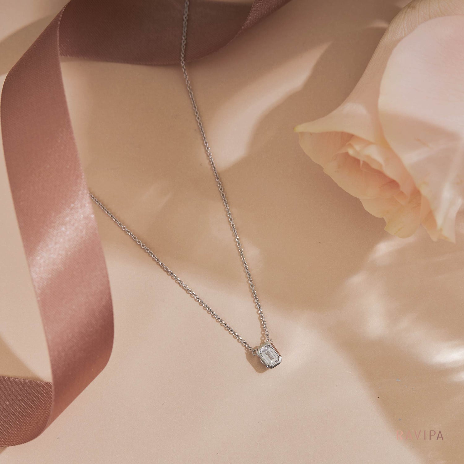 Emerald Cut Diamonds with CZ of necklace were cut in rectangular shapes which were cut the corner as a layer and could wear in everyday life. These respond to all desire of lady in term fashionable, minimal and luxurious style at the same time.