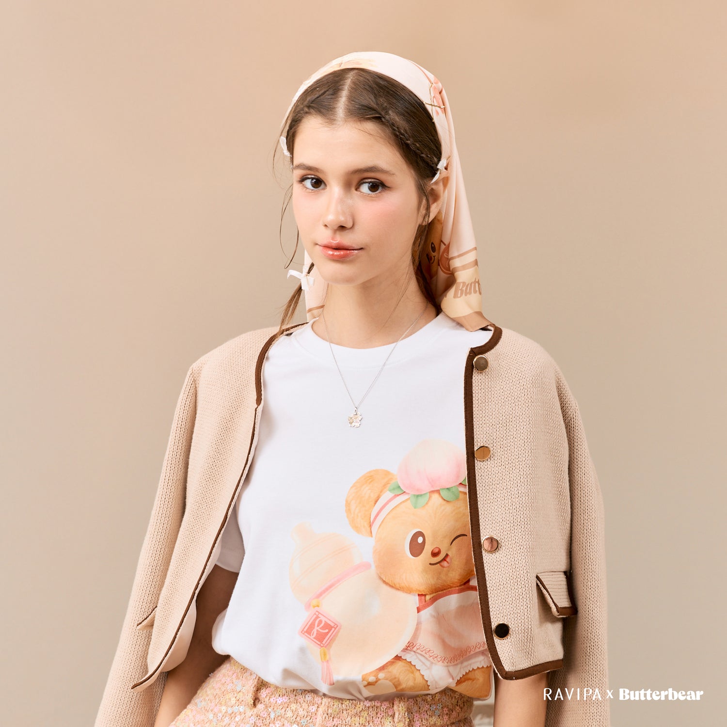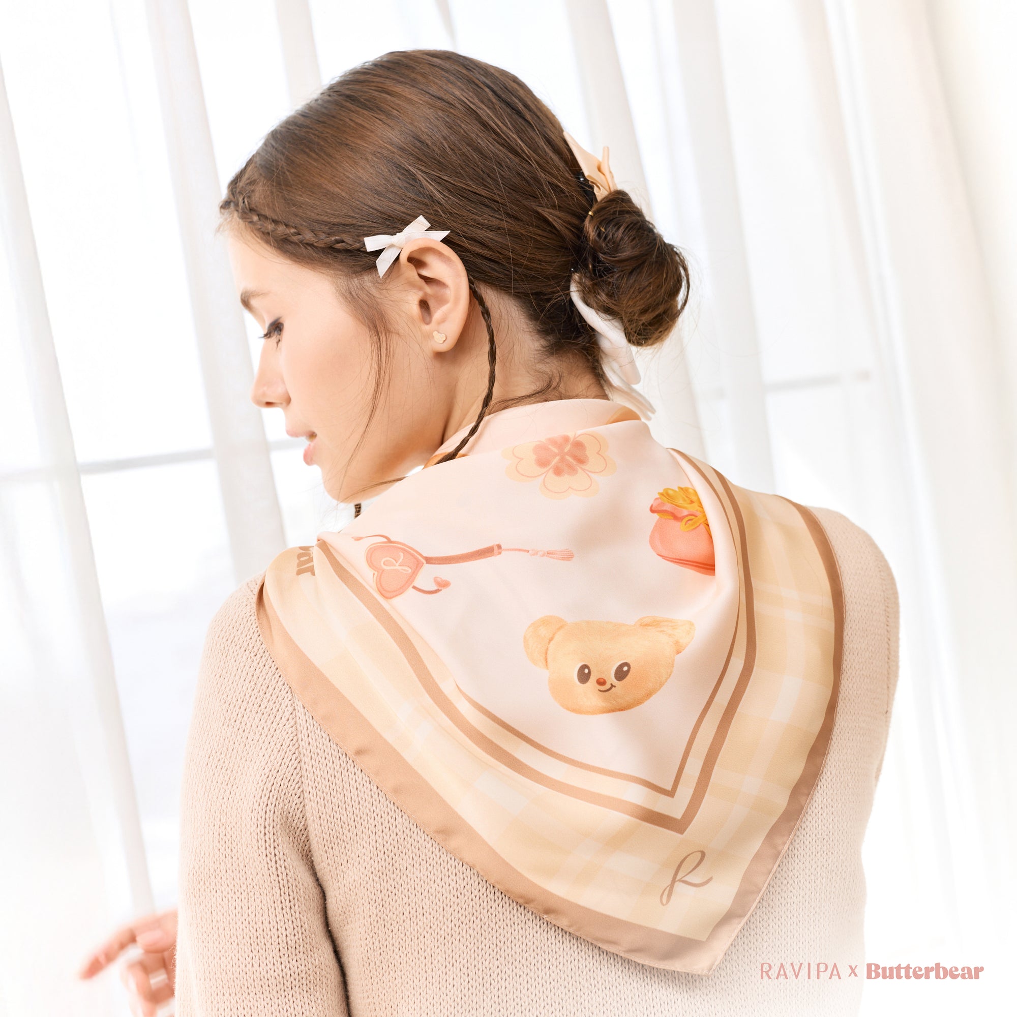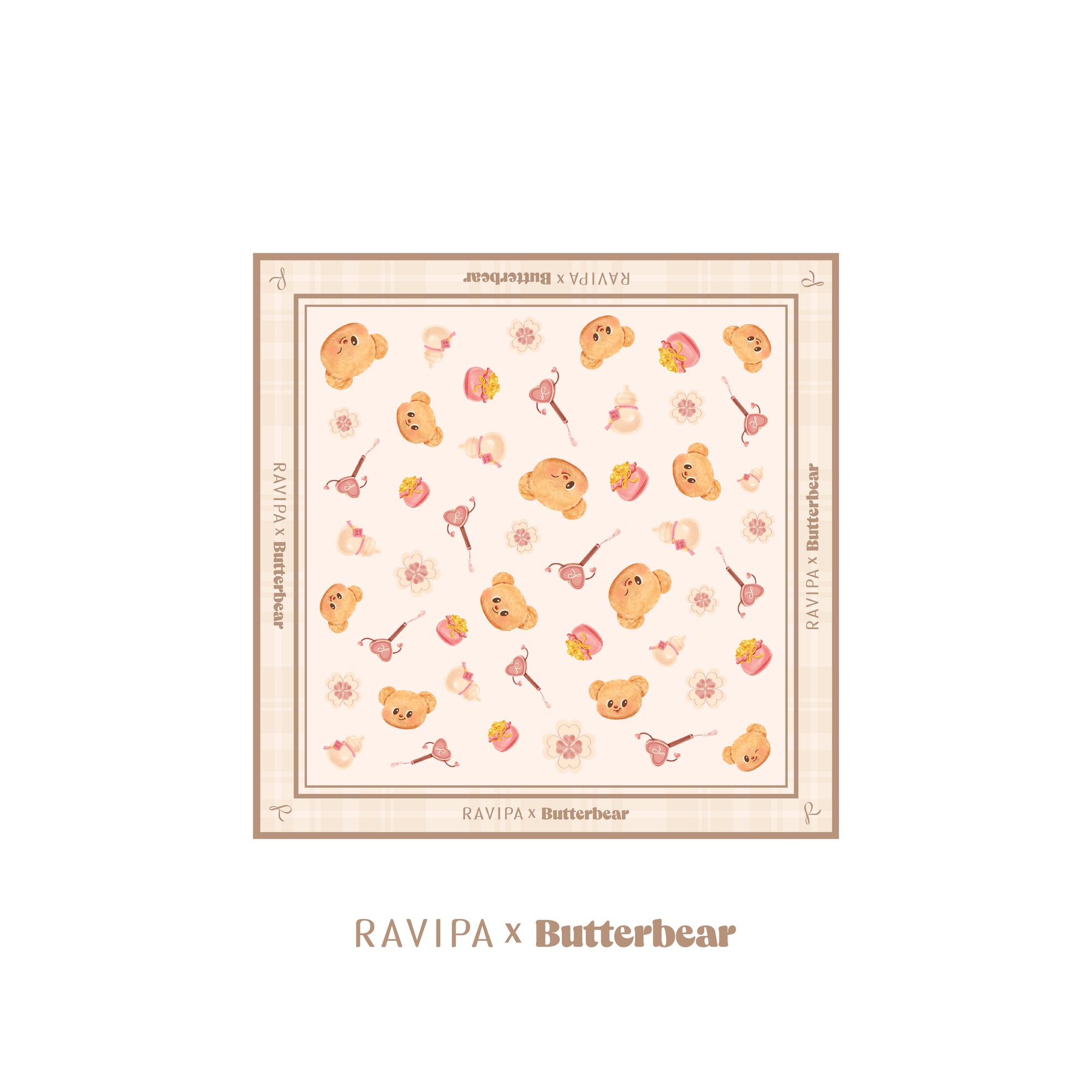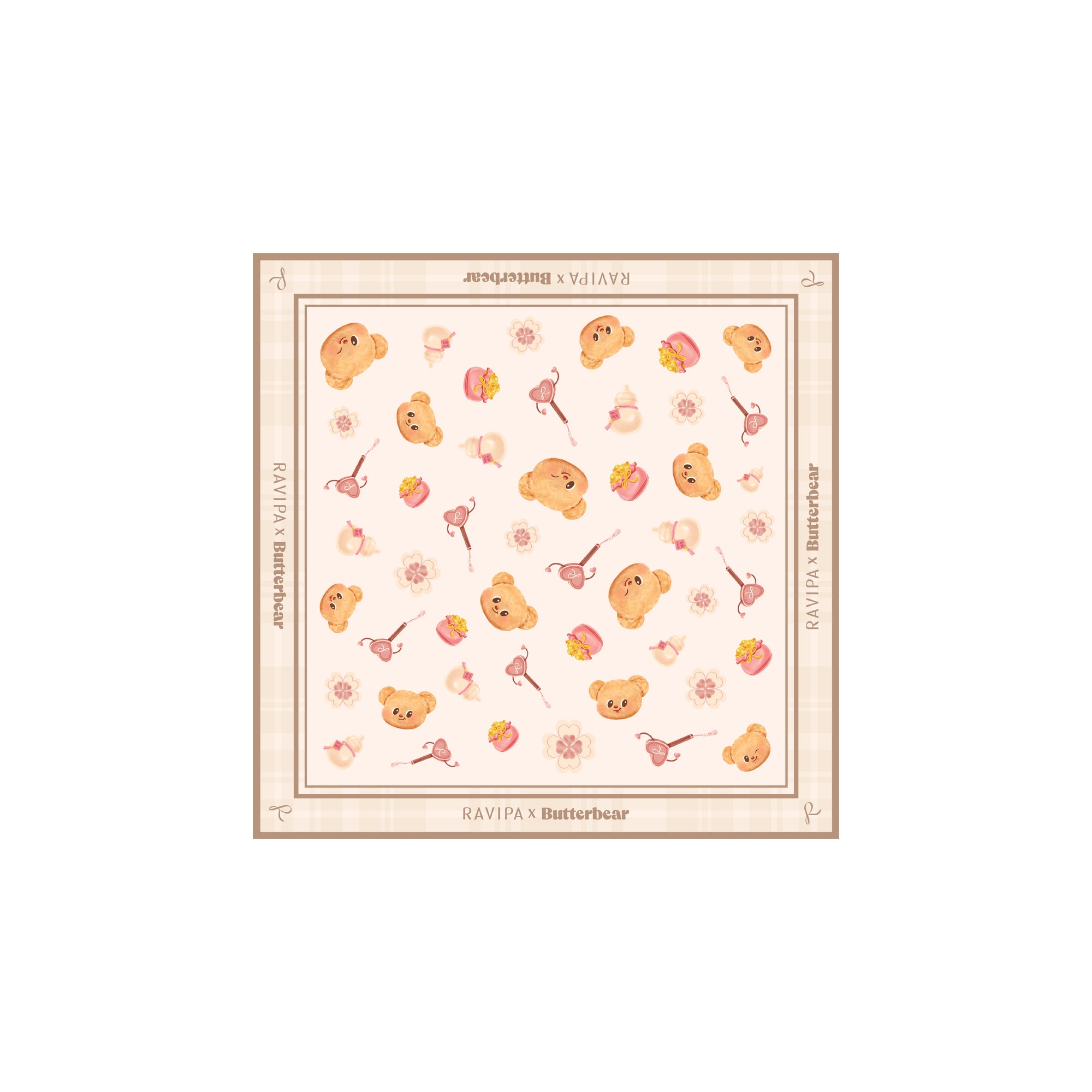 RAVIPA x Butterbear Scarf embodies positivity, joy, and good fortune. Its playful design includes symbols like